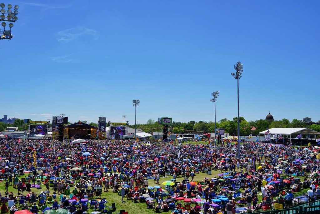 Late spring in New Orleans is typically warm — and sometimes downright hot — so plan to wear lightweight clothing or breathable layers. Sun protection (sunglasses, sunscreen, hat) is essential since shade is limited. While a few trees and covered stages offer brief breaks from the sun, most of the festival takes place out in the open.