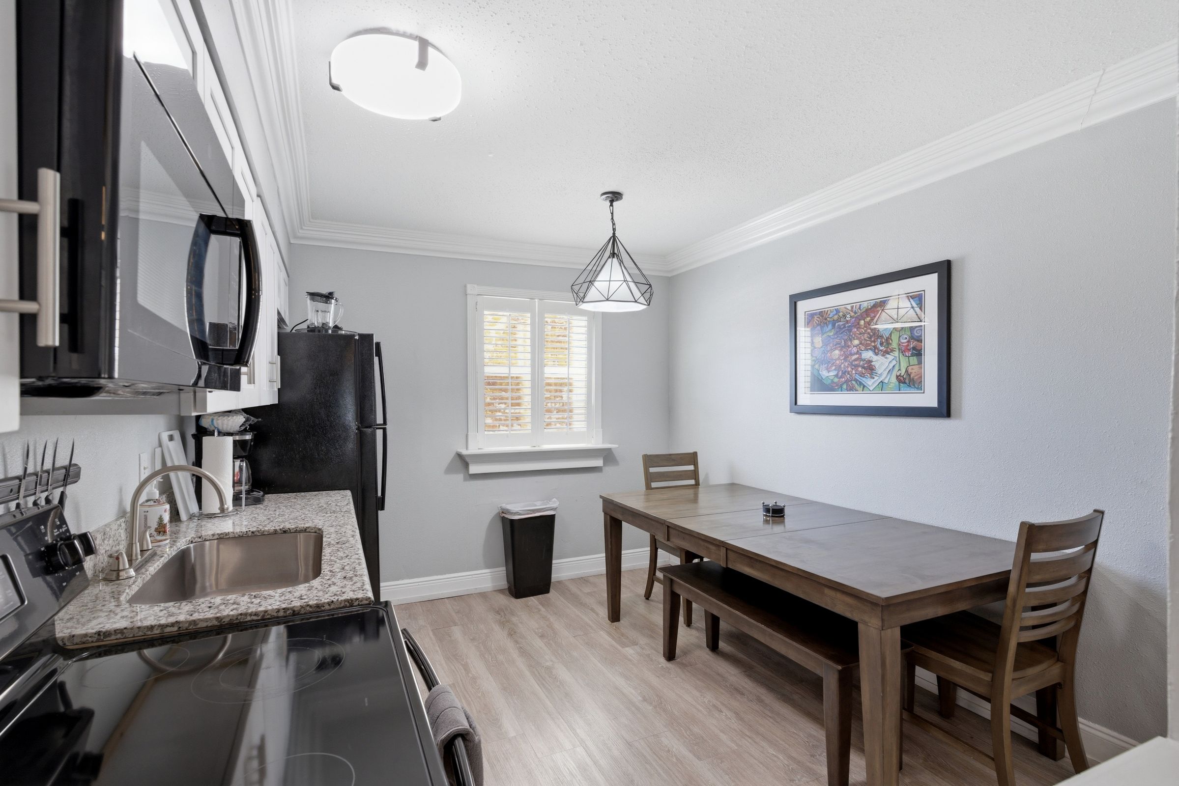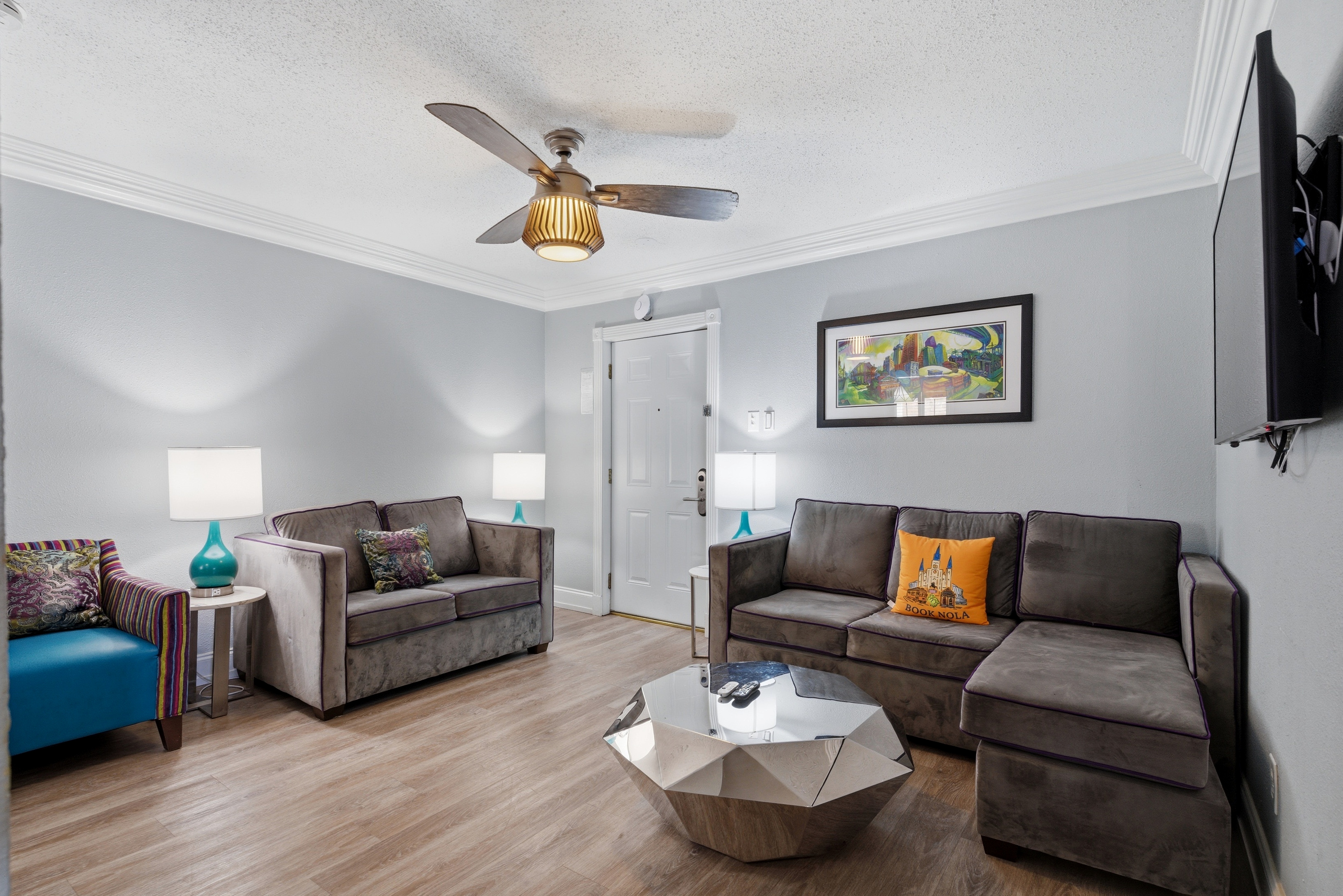 Inside, the layout features a king bedroom and a queen bedroom, ideal for couples, friends, or small groups. The open-concept living area flows into a fully equipped kitchen, making it easy to relax and recharge after exploring the French Quarter, Bourbon Street, and Canal Street.
